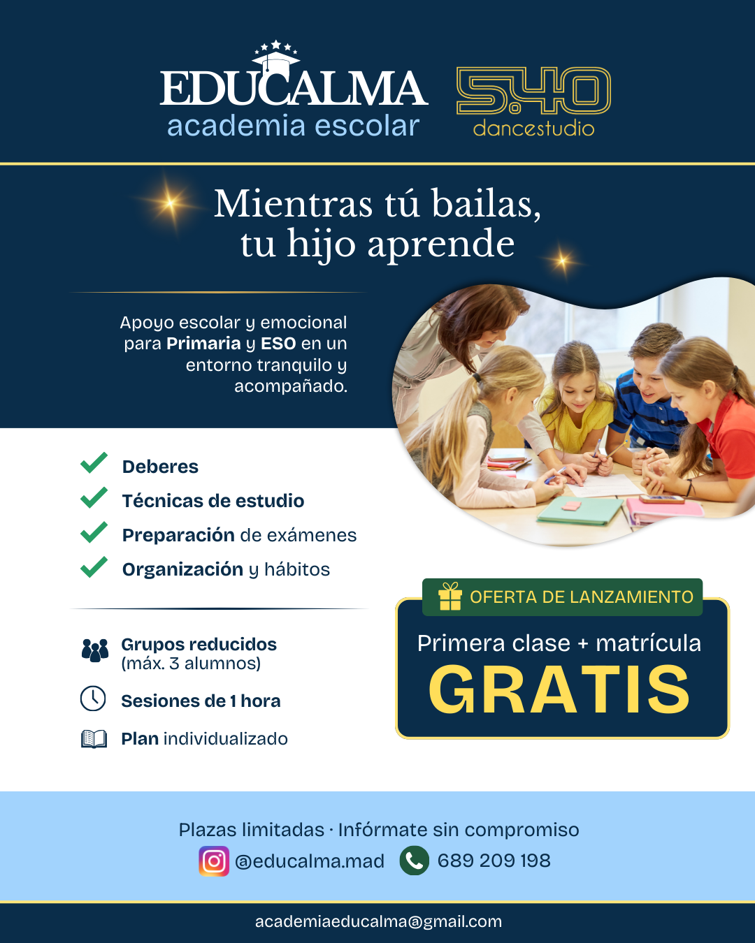 Mientras tú disfrutas de tu clase de baile, tu hijo aprovecha el tiempo recibiendo apoyo escolar en otra sala, en un entorno tranquilo, seguro y acompañado.